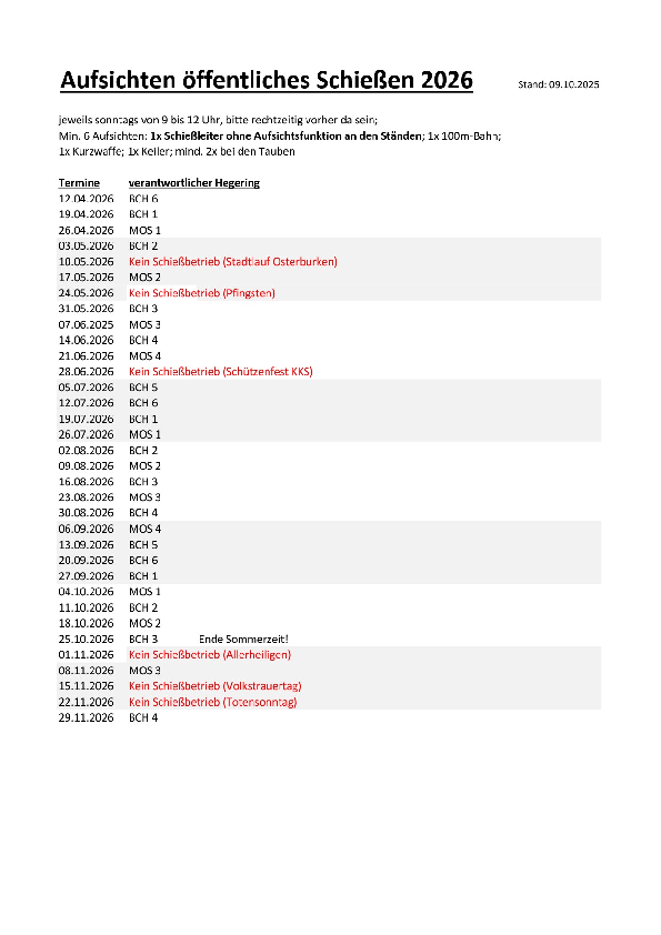 Am 10.Mai, 24.Mai, 28.Juni, 1.November, 15.November und 22.November findet kein Schießbetrieb statt.